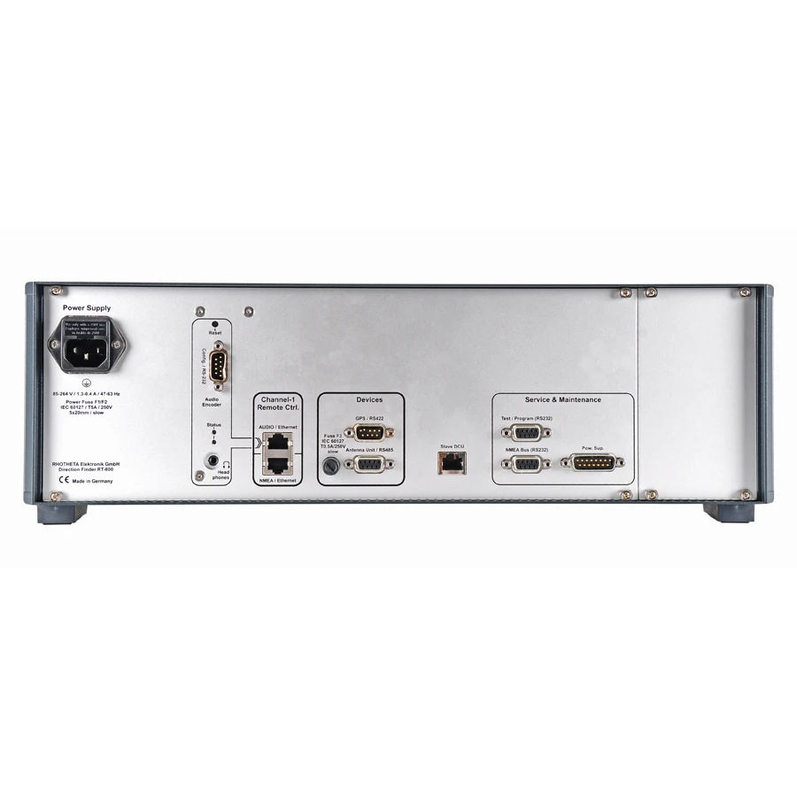 | Interface: | Ethernet Interface for complete remote control (NMEA Protocol: Input / Output) Ethernet Interface for IP streaming audio out RS232 (NMEA Protocol: Input / Output) PTT input (for ground transmitter suppression) Alarm Relay Output Input for optional external GPS (RS422) |
